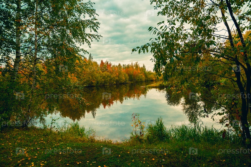 Красочный осенний пейзаж возле лесного озера, заросшего деревьями и кустарниками