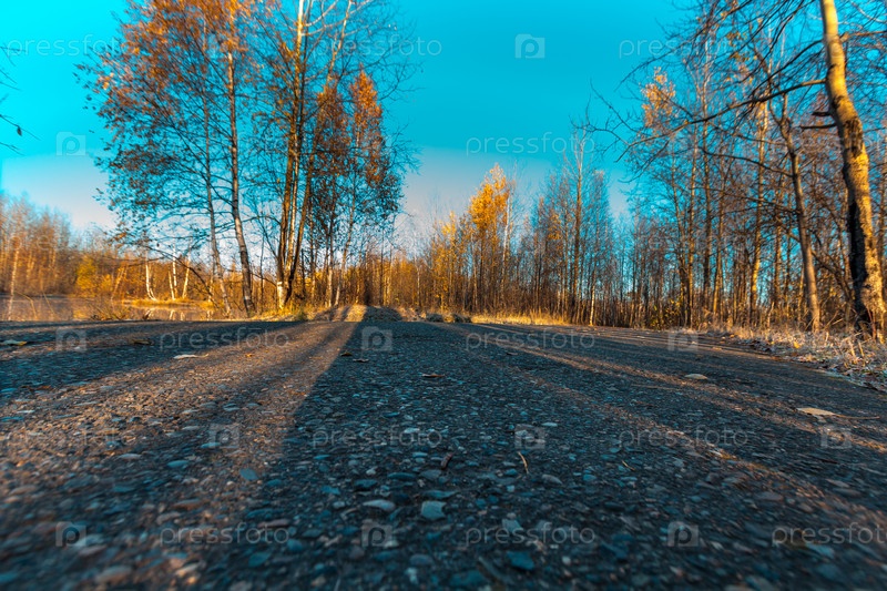 Лиственный осенний лес растет вдоль асфальтовой дороги для скандинавской ходьбы и пробежек