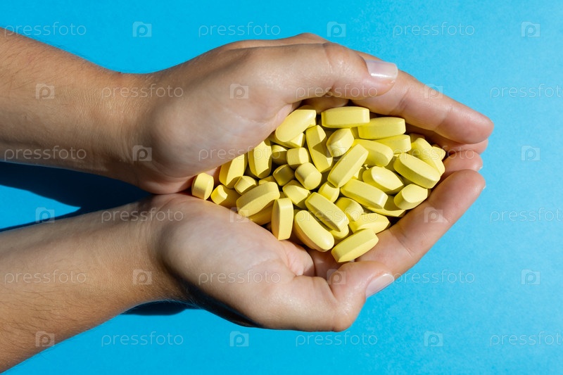 Руки врача, держащего много лекарств, витаминных капсул или таблеток на синем фоне