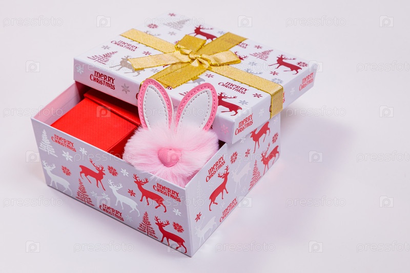 Рождественский баннер, праздничная коробка с игрушками на белом фоне. Заячьи ушки из коробки