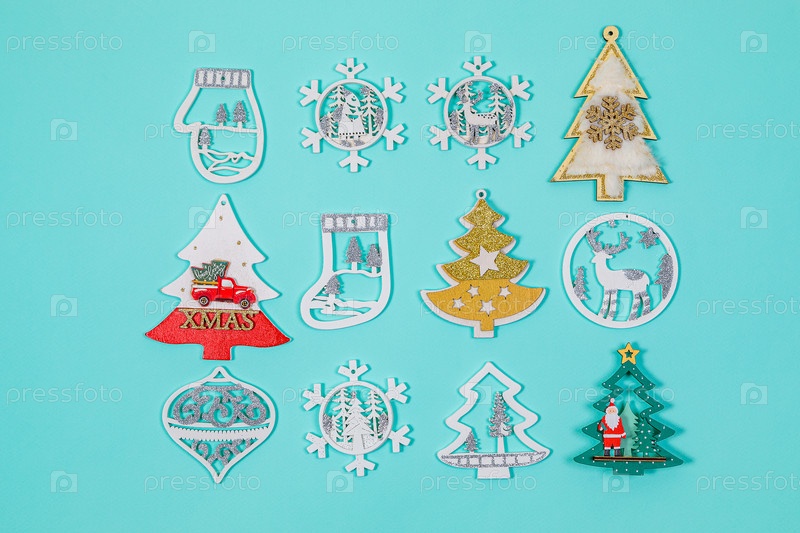 Рождественские игрушки, елочные украшения на синем фоне
