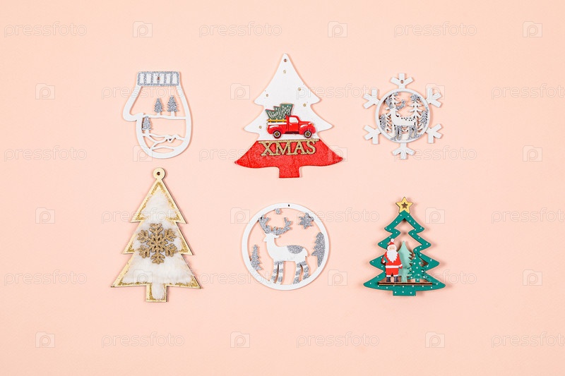 Новогодние игрушки, украшения для елки на розовом фоне