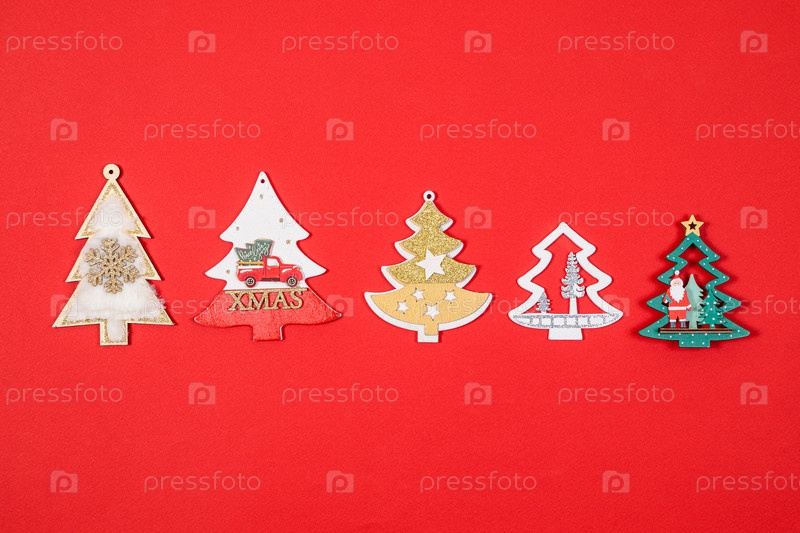 Новогодние игрушки, украшения для елки на красном фоне