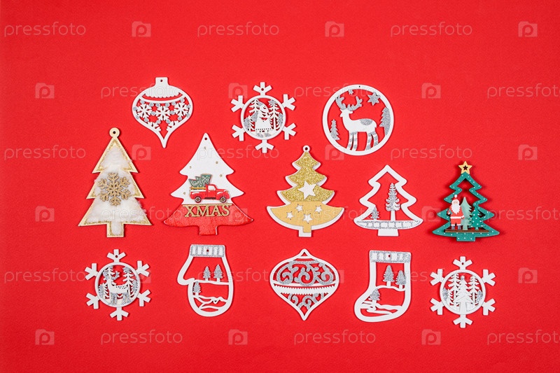 Новогодние игрушки, украшения для елки на красном фоне