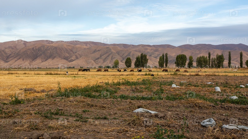 Лошади и коровы на пастбище на фоне гор, утро в степи Кыргызстана