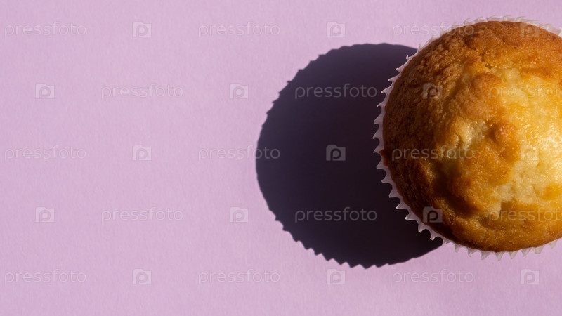 Вкусный кекс на фиолетовом фоне, концепция нездоровой пищи