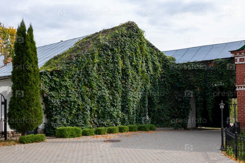 Вьющаяся лиана на фасаде дома, увитая вертикальными растениями дикого винограда или зеленый экодом, увитый плющом. Зеленый фасад экодома представляет собой вечнозеленую живую изгородь, заросшую диким виноградом, увитую плющом