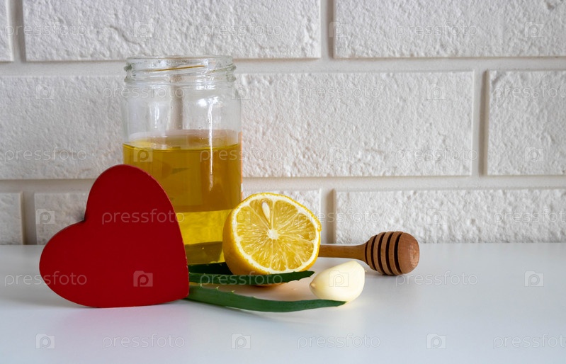 Красное деревянное сердце и натуральные средства от простуды на белом столе на кирпичном фоне. Чеснок, мед, лимон, алоэ народные средства от осенней простуды, ковид 19