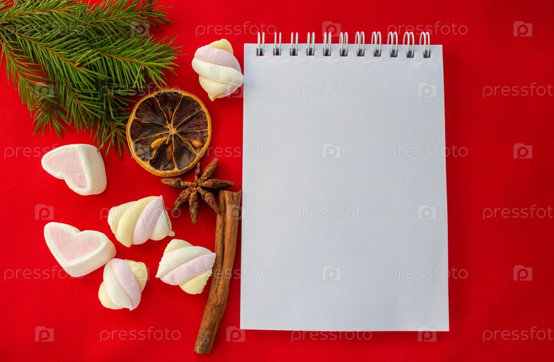 Блокнот, конфеты и еловые ветки на красном фоне. Новогодняя композиция. Место для вашего текста