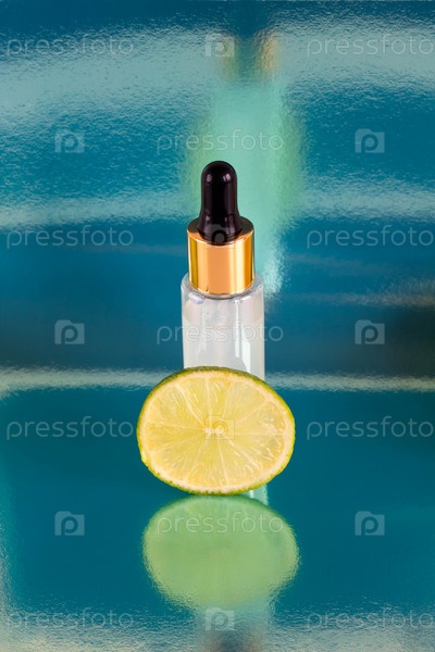 Кусок лайма и матовая бутылка с пипеткой, изолированные на глянцевом синем фоне. Макет подходит для дизайна косметики