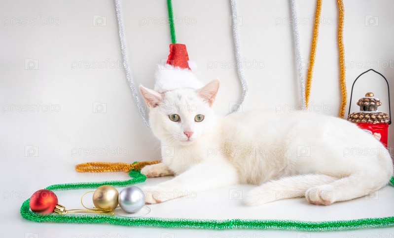 Портрет белого кота в шляпе Санта-Клауса крупным планом на белом фоне. Домашнее животное смотрит в кадр. Концепция доверия. Рождество и Новый год