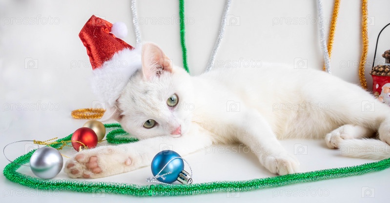 Портрет белого кота в шляпе Санта-Клауса крупным планом на белом фоне. Домашнее животное смотрит в кадр. Концепция доверия. Рождество и Новый год