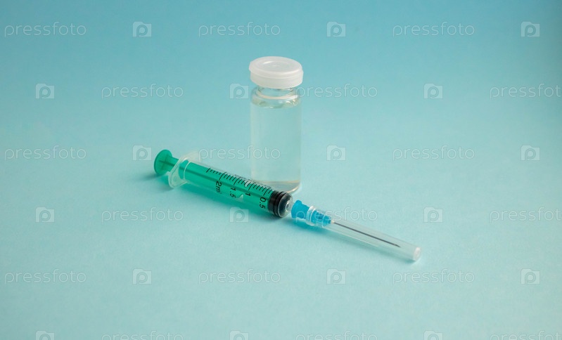 Шприц и бутылка с вакциной стоят на синем фоне. Для профилактики, иммунизации и лечения коронавирусной инфекции. Концепция медицины и здравоохранения
