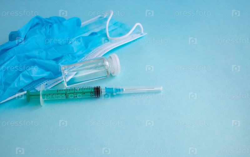 Шприц, перчатки, маска и флакон с вакциной стоят на синем фоне. Для профилактики, иммунизации и лечения коронавирусной инфекции. Концепция медицины и здравоохранения