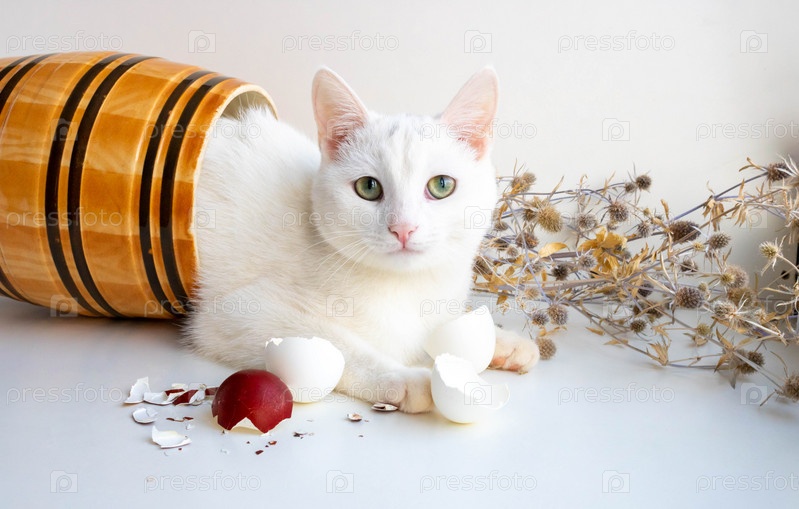 На белом фоне лежит глиняная бочка с белым котом, рядом с засохшими цветами и яичной скорлупой. Концепция Пасхи