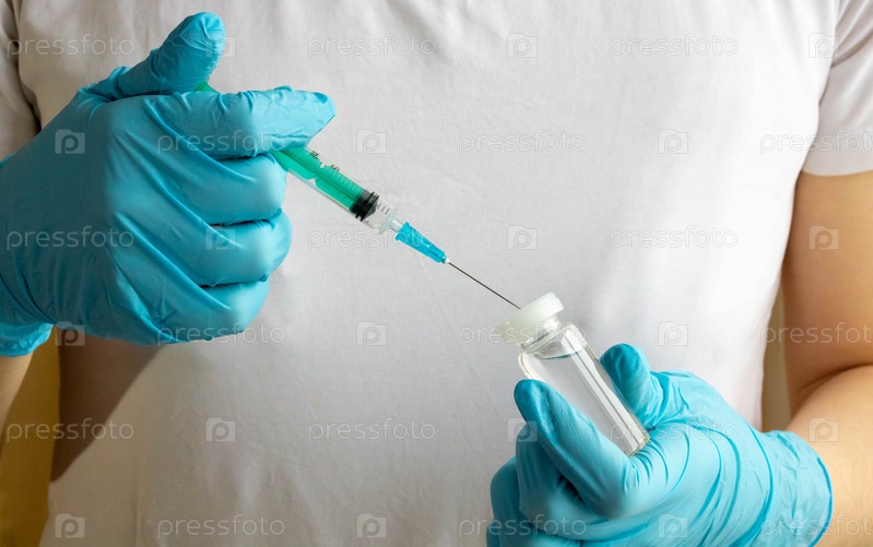 Руки в синих перчатках наполняют шприц вакциной. Концепция медицины и здравоохранения