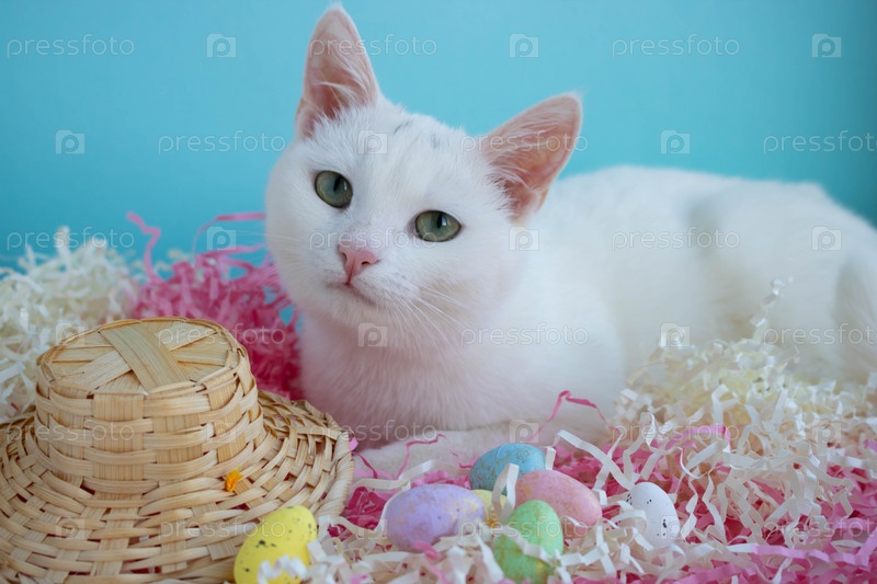 Милый белый кот лежит на мишуре рядом с яйцами и соломенной шляпой. Пасхальная концепция
