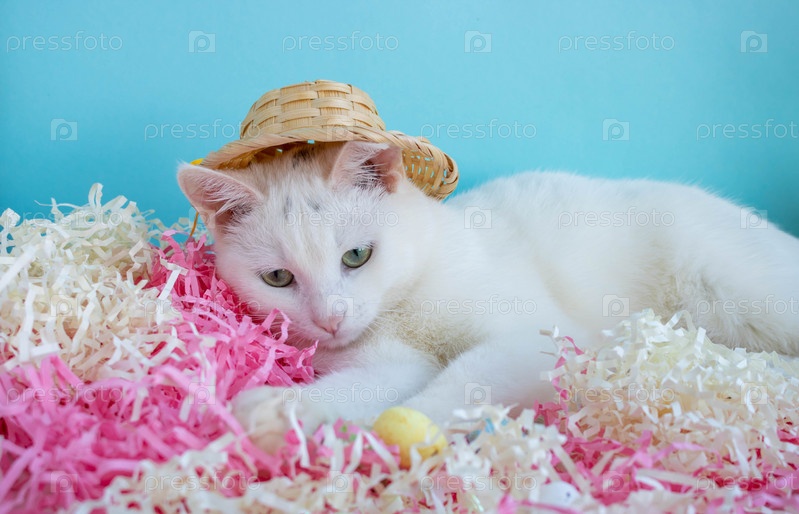 Милый белый кот в соломенной шляпе лежит на мишуре рядом с яйцами. Пасхальная концепция