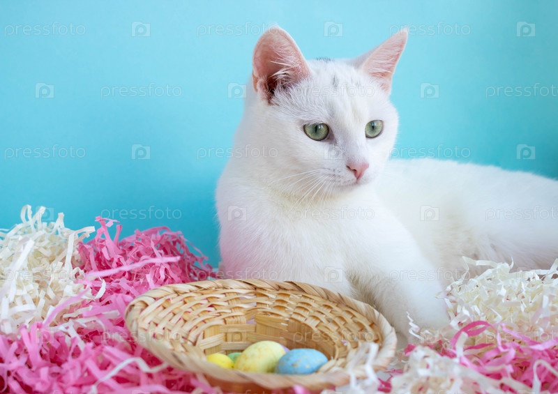 Милый белый кот лежит на мишуре рядом с яйцами и соломенной шляпой. Пасхальная концепция