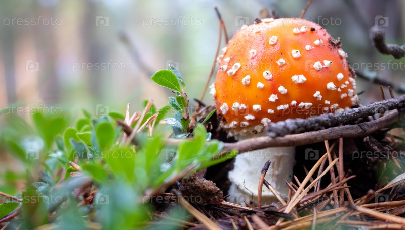Красный мухомор с белыми точками в лесу на поляне