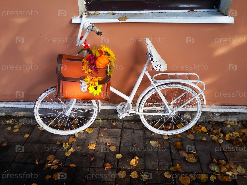 Ретро-велосипед с кожаным школьным портфелем с осенним декором стоит у стены под окном. Концепция осени, школы, Хэллоуина