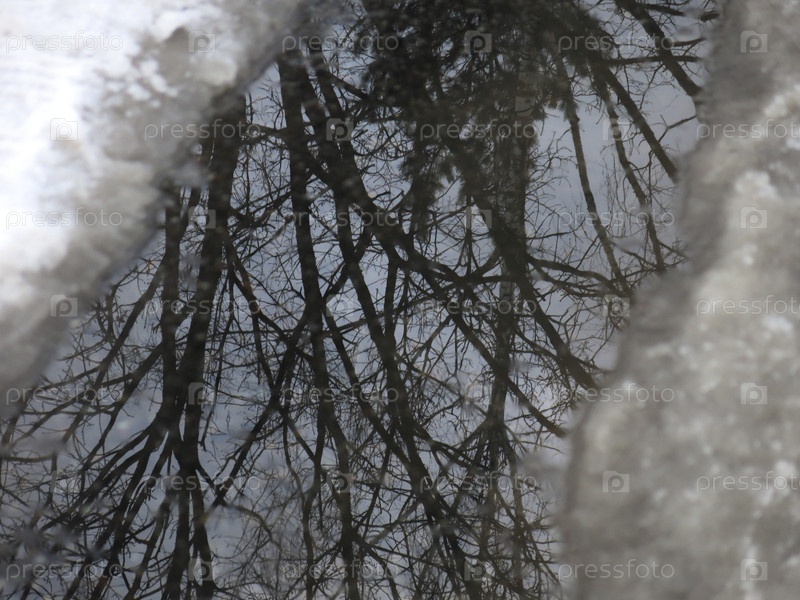 Черные силуэты голых деревьев отражаются весной в серой луже