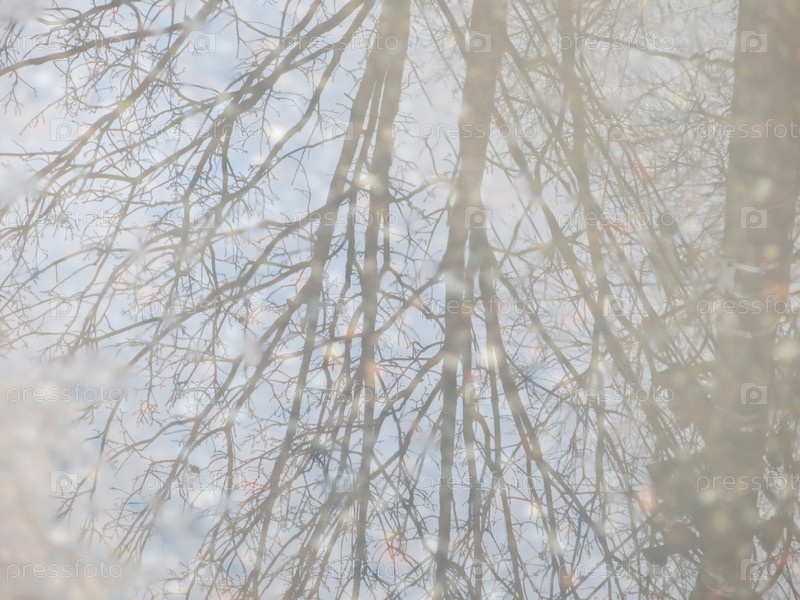 Черные силуэты голых деревьев отражаются весной в серой луже