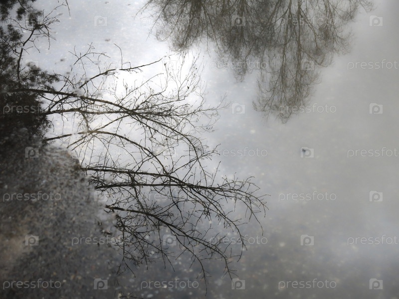 Черные силуэты голых деревьев отражаются весной в серой луже