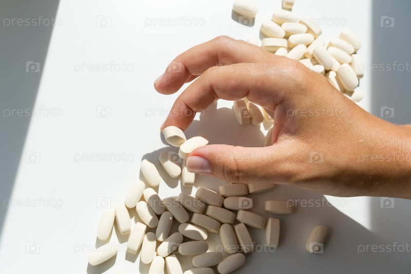 Рука принимает витаминные капсулы или таблетки с лекарствами. Здравоохранение или медицинская концепция