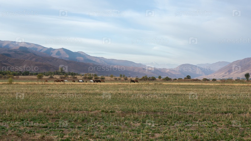 Лошади на пастбище на фоне гор, утро в степи Кыргызстана