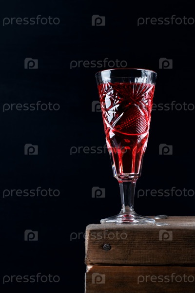 Ягодный ликер в хрустальной винтажной рюмке на деревянном столе на черном фоне