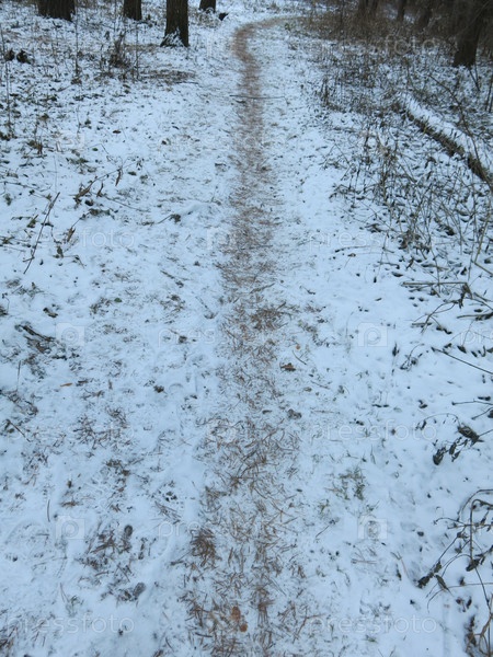 Тропинка в зимнем лесу между деревьев