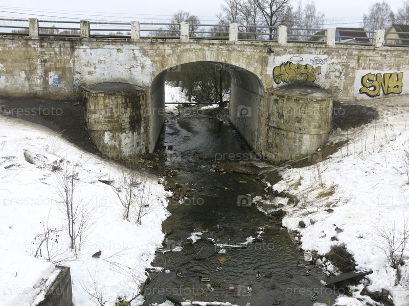 Вода весной течет под старым большим кирпичным мостом, а внизу плавают утки