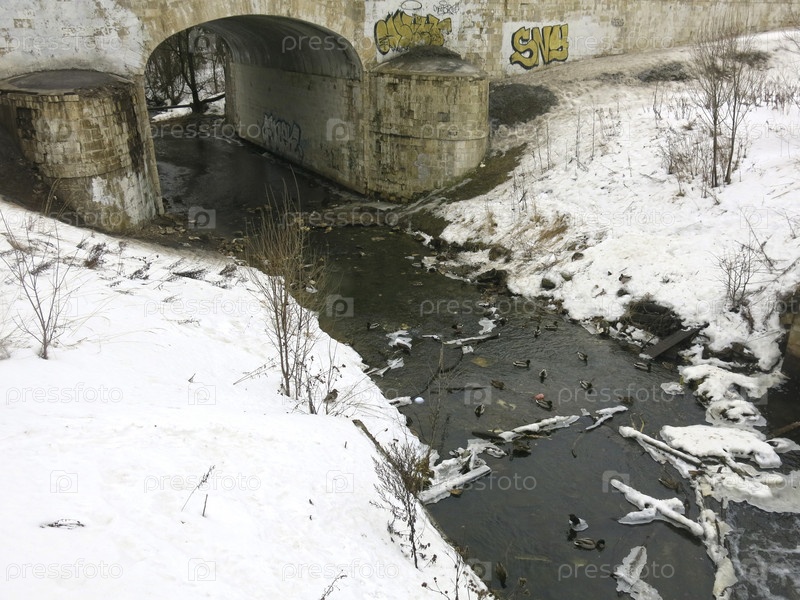 Вода весной течет под старым большим кирпичным мостом, а внизу плавают утки
