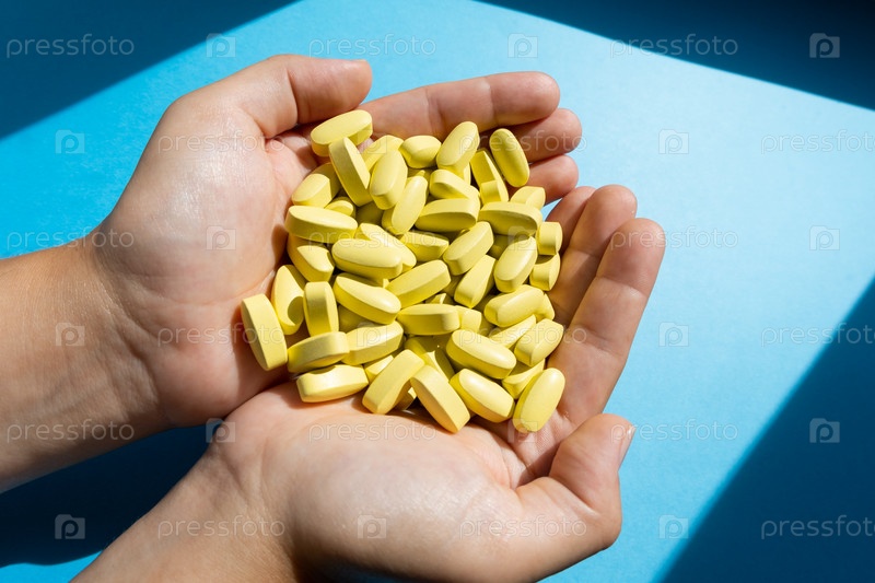 Руки доктора держат много витаминных капсул или таблеток с лекарствами. Здравоохранение или медицинская концепция