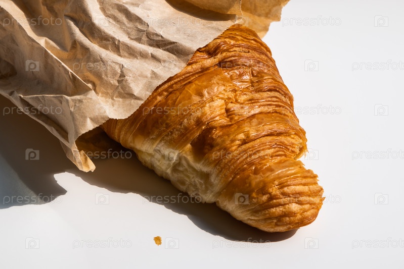 Вкусный свежий круассан в коричневом ремесленном пакете, концепция нездоровой пищи