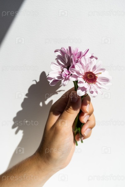 Букет фиолетовых хризантем в руке на белом фоне, вид сбоку
