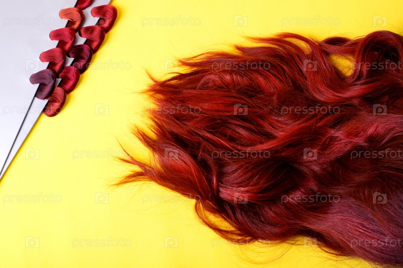 Длинные рыжие волосы и палитра с образцами краски для волос на желтом фоне. Окрашивание волос в разные оттенки оранжевого цвета. Плоская укладка. Макет с копией пространства