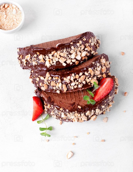 Сладкие тако с тонкой шоколадной вафлей и мороженым с орехами и клубникой на белом столе. Десертная вариация мексиканской классики