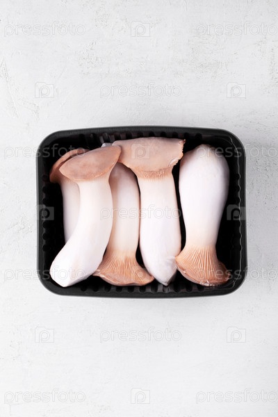 Королевские вешенки, эринги, в контейнере на белом столе. Вид сверху