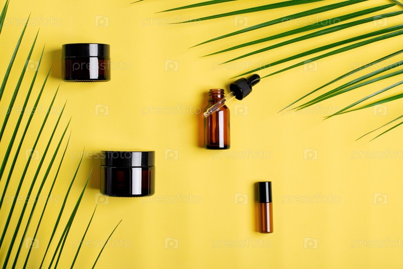 Косметический набор контейнеров для средств по уходу за кожей на желтом. Плоская укладка. Упаковка косметики