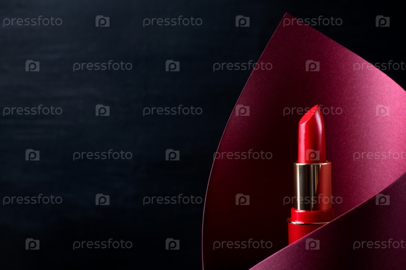 Красная помада внутри красной бумаги, вырезанной на темном фоне