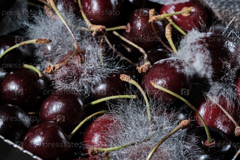 Бургундские ягоды вишни и белая плесень. Испорченная еда. Крупный план. Выборочный фокус
