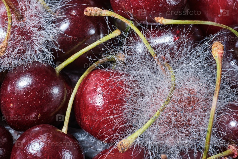 Бургундские ягоды вишни и белая плесень. Испорченная еда. Крупный план. Выборочный фокус