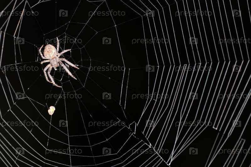 Паук сидит в центре паутины на черном фоне. Выборочный фокус