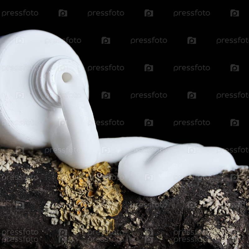 Крупный план фрагмента открытой трубки с белым кремом на темном фоне. Минималистичная концепция борьбы с грибковыми заболеваниями кожи. Выборочный фокус