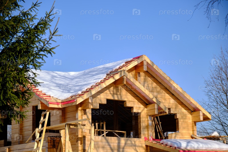 Деревянный загородный дом из строящегося бруса. Пригородный зимний пейзаж