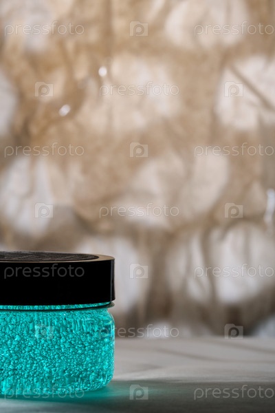 Крупный план баночки косметики на абстрактном фоне. Бирюзовый гель. Выборочный фокус. копировать пространство