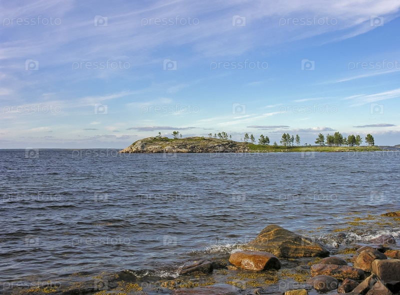 Небольшой скалистый островок, поросший редкими соснами. Вид с острова Горелый, Керетская губа, Кандалакшкий залив Белого моря, Карелия. Солнечный день в июле