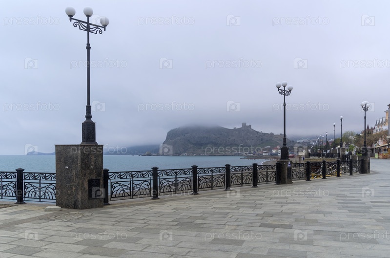 Пустая набережная в небольшом курортном городе Судак, Крым. Конец апреля, пасмурно, низкая облачность. Не сезон